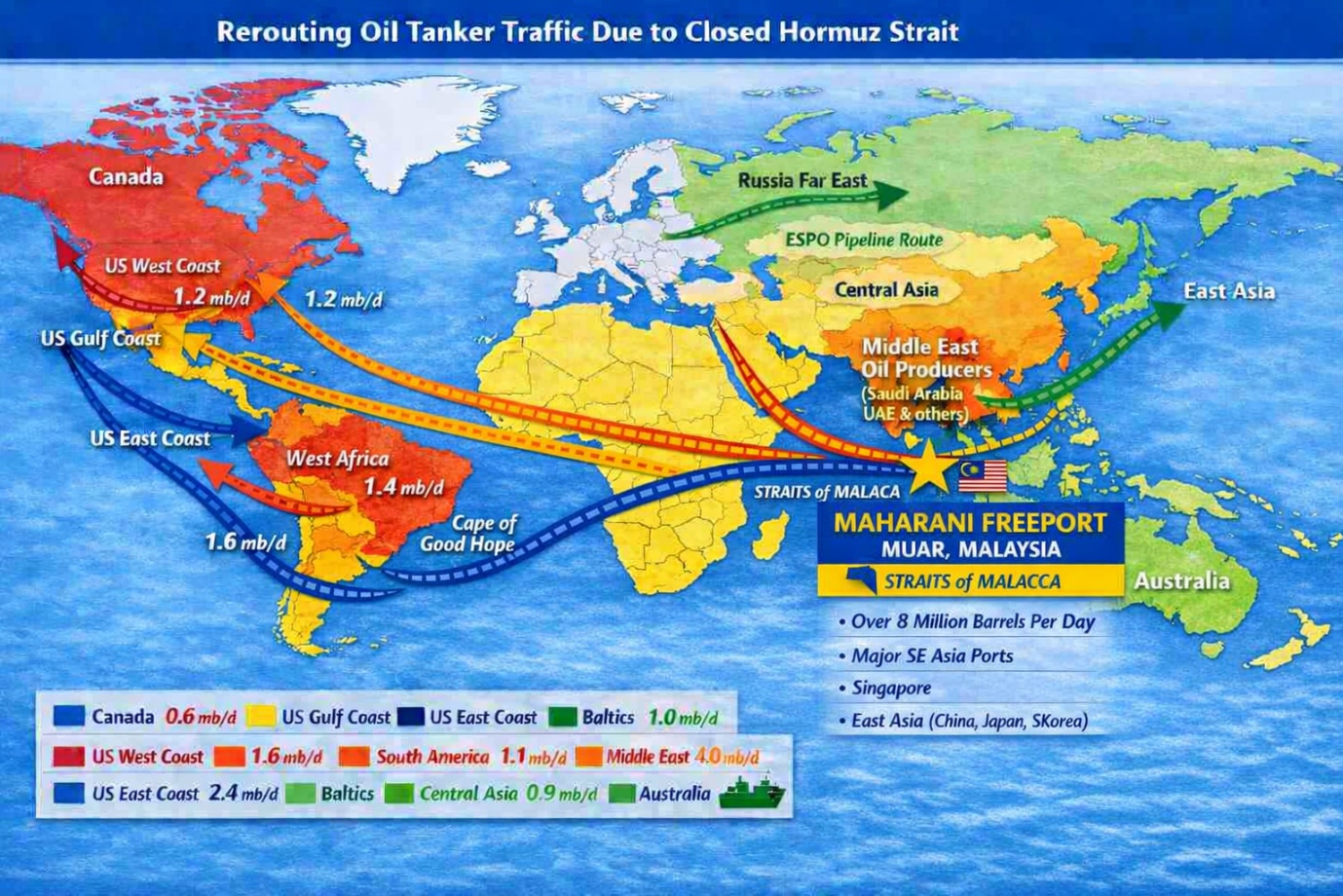 Other than Malaysia's own production of premium light sweet crudes, which are largely exported, and other Asia-Pacific grades, alternative supply sources and sea routes include Russia, via two key corridors. The ESPO Pipeline linking Kozmino port on the Russian Pacific coast provides an eastward sea route to Southeast Asia, bypassing all Middle East chokepoints. And the Baltic/Black Sea route around the Cape of Good Hope to the Indian Ocean and then the Malacca Strait is longer, but viable.